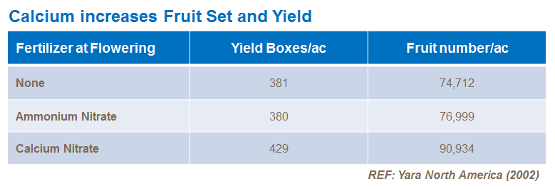 Calcium, as calcium nitrate helps boost fruit set and fruit number. Timing is critical, and significant fruit set improvement come from applications made immediately prior to and during flowering. Less than 30mg of calcium in the fruitlet at 5 weeks will lead to increased fruit drop.