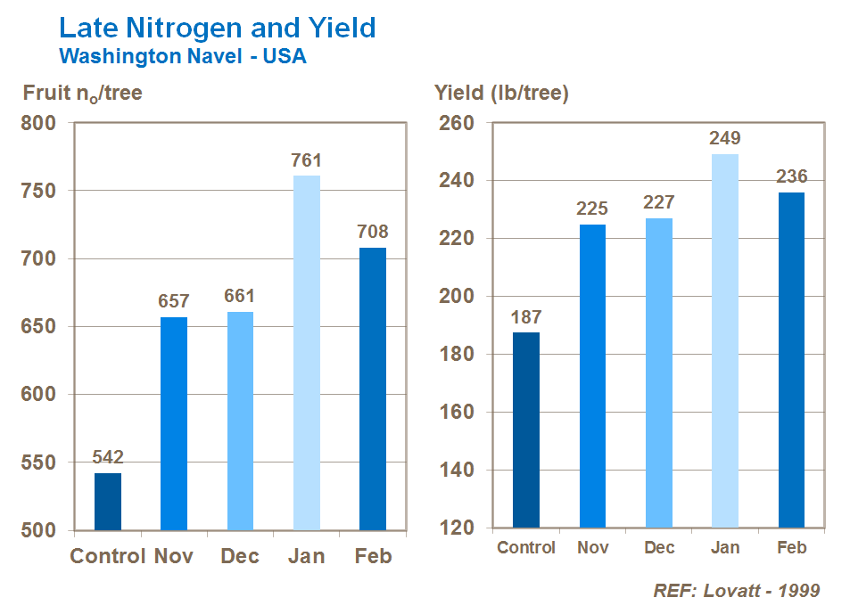Around 80% of the nitrogen in fruit and leaves in mature trees originates from tree reserves rather than from fertilizer N applied in that growing season. Pre-bloom foliar sprays made in the winter can help increase yields in the following season by increasing fruit number.