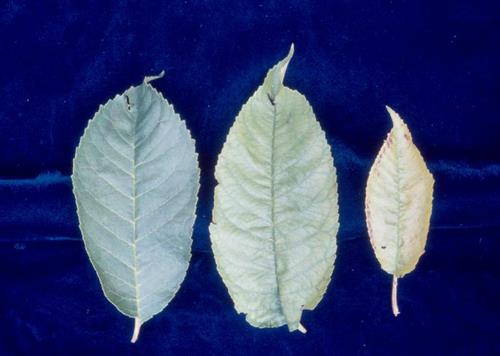 Leaf growth is reduced and leaves are pale green / yellow in colour. Chlorotic leaves eventually develop necrotic blotches near the margin. Symptoms start at younger leaves.