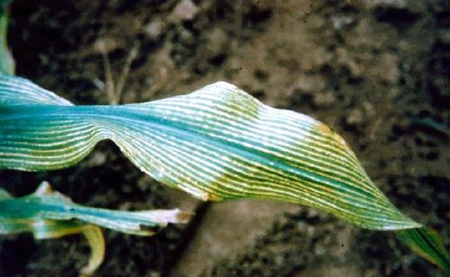 First symptom is interveinal chlorosis at the older leaves. Yellow to white stripes or typical beaded lesions occur; tissue along the main vein stays green for the longest time.