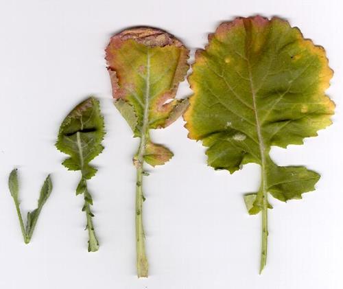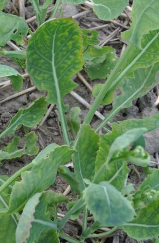 Symptoms of sulphur deficiency are visible on younger leaves first. They become light green or yellow, partly with violet or reddish colours at severe deficiency. In addition, the younger leaves remain small and narrow. Flowering of the rape plants is inhibited.