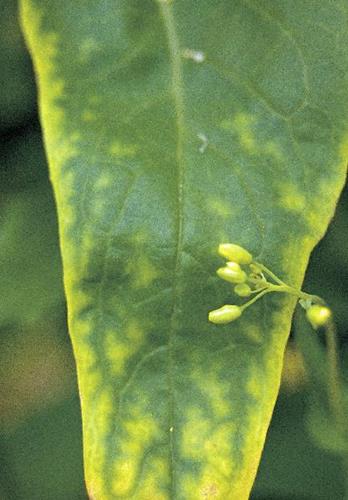 Chlorosis with green veining can also be caused by Mg deficiency (on older leaves) or Fe or Mn deficiency (on younger leaves).