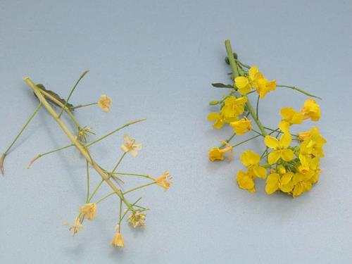 Flowering of the rape plants is inhibited and the flowers are deformed. At severe deficiency, they have a white/yellow colour. As a consequence from poor flowering, the pod formation is also restricted, and if pods are formed, they are clearly smaller and do not contain many seeds so that the yield is severely restricted at sulphur deficiency.