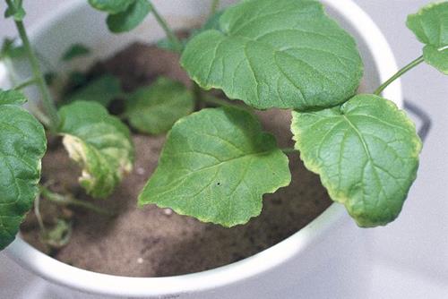 Older leaves show chlorosis and commencing necrosis towards the leaf tips and margins.
