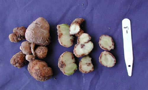 B deficiency leads to small tubers with skin crackings and brown areas under the skin at the stolon end or in the vascular ring.