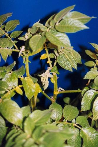 The complete plant shows paling and yellowing. Young leaves are thickened, crinkled and cupped upward.