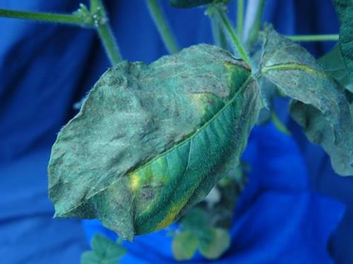 Upper leaves turn yellow and become mottled with small, brown necrotic spots.