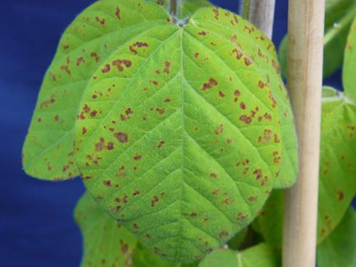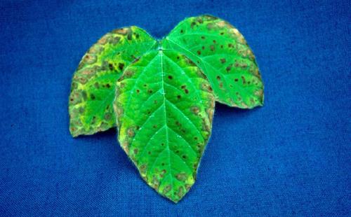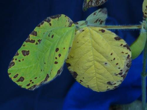 Necrotic spots appear on the interveinal fields and spread over the leaf blade.
