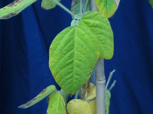 The upper leaves turn yellowish green or chlorotic. Discoloration and necrosis along the leaf margin can occur.