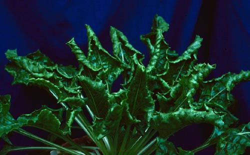 The leaves are cupped upwards and the whole plant has an upright appearance. Younger leaves show chlorotic leaf blades, while the leaf veins and a small margin around them remain green.