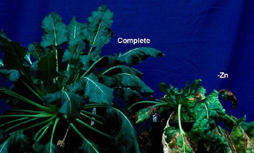As first symptom of Zn deficiency, plants show chlorosis appearing on the larger leaves near the center of the plant. Small yellow or whitish spots can develop on the upper side of the leaves. As the spots enlarge irregularly, the entire intercostal area becomes dry and necrotic.