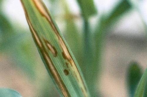 In the present case, a mature leaf exhibits irregular light brown lesions, bordered by a dark brown margin.